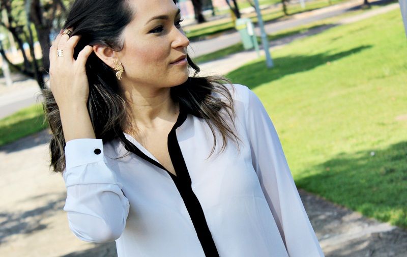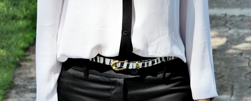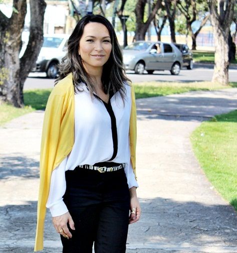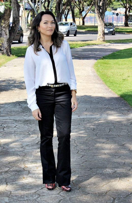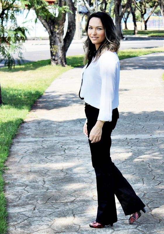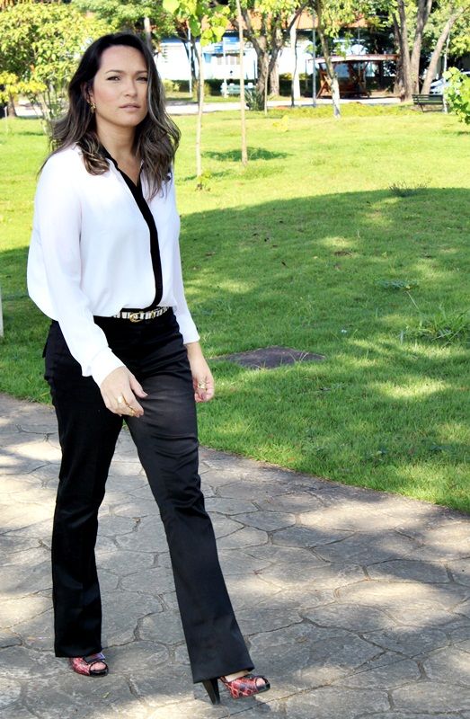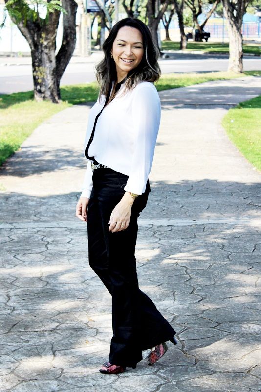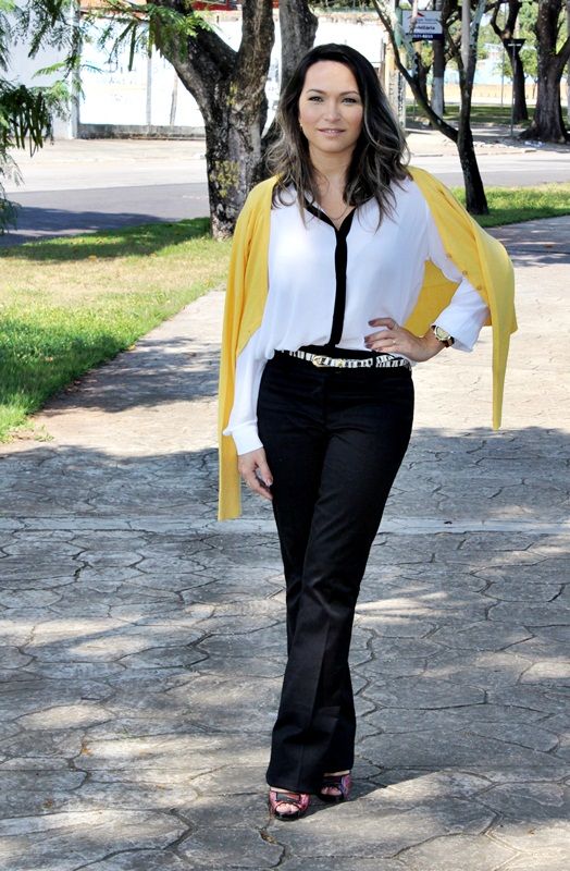Pensando nessa mistura, separamos esta camisa de crepe bem fininho branca com detalhe em preto, juntamos com a calça flare preta, acrescentamos o cinto com estampa de zebra e o cardigam amarelo, que além de vir aquecendo todo o visual, deu uma certa alegrada ao look. Olhem só: